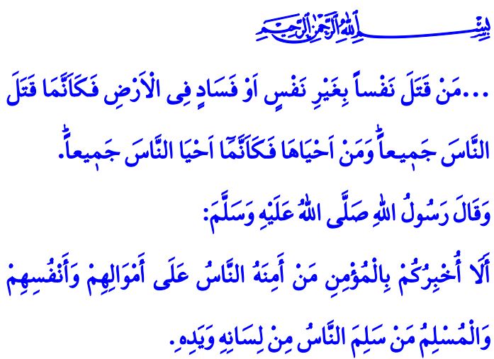 Dinimize göre asıl olan şefkattir, merhamettir, yaşatmaktır. Allah’ın masum kıldığı cana kıymamak, zarar vermemektir. Nitekim Yüce Kitabımız Kur’an’da şöyle buyrulmaktadır: “…Bir cana kıymaya veya yeryüzünde fesat çıkarmaya karşılık olması dışında, kim bir kimseyi öldürürse bütün insanları öldürmüş gibi olur. Kim de bir can kurtarırsa bütün insanların hayatını kurtarmış gibi olur.”3