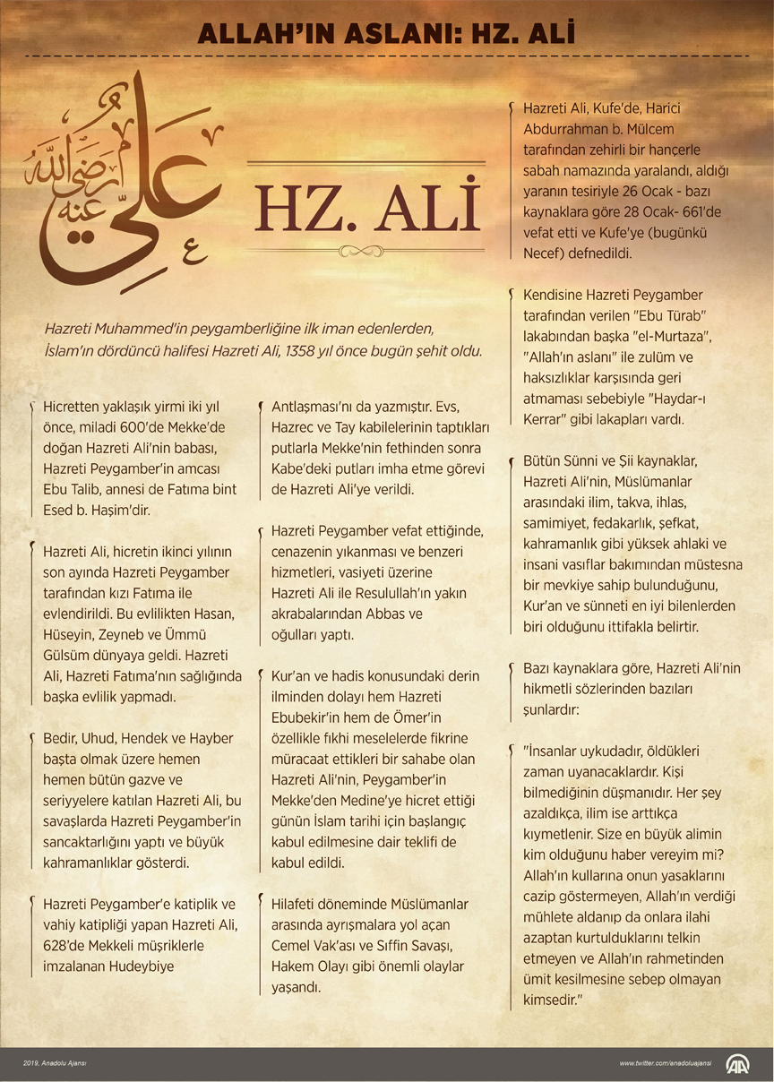 Hazreti Muhammed'in peygamberliğine ilk iman edenlerden, İslam'ın dördüncü halifesi Hazreti Ali, 1358 yıl önce bugün şehit oldu.