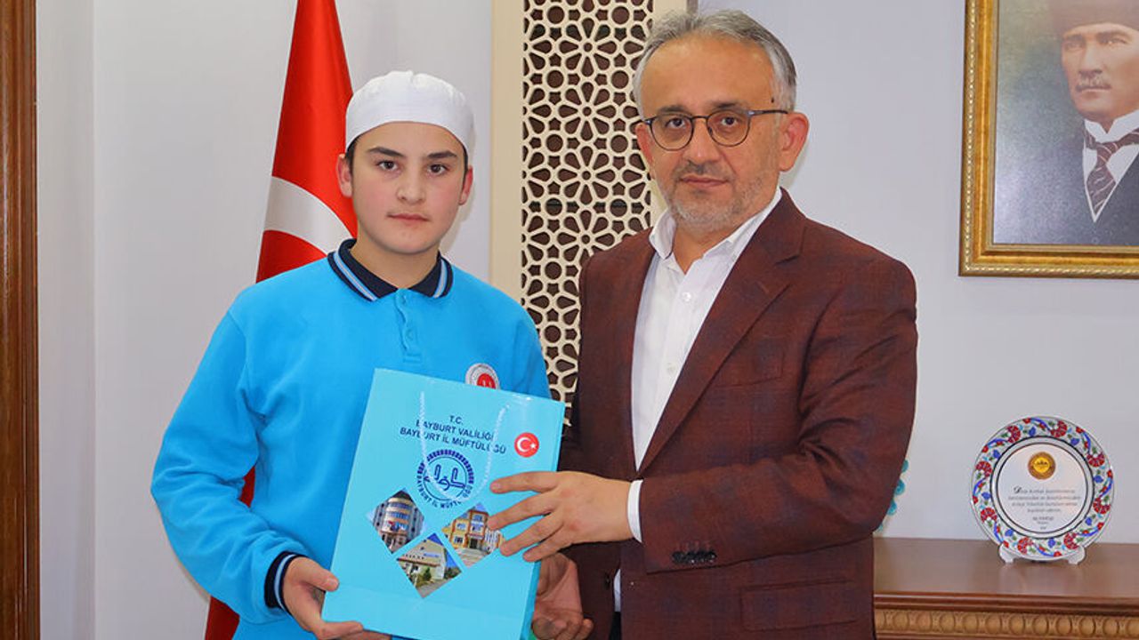 Hafız Mert Kaan Dursun'u Müftülük Makamında kabul eden İl Müftüsü Bayram Danacı, tebrik ederek hediye takdim etti.