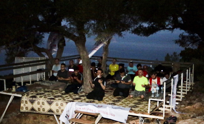 Taşlık Burnu Feneri'ne ulaşılmasıyla fener alanında abdest alan gençler, İl Müftüsü Yalçınkaya’nın imametinde sabah namazını kıldı.