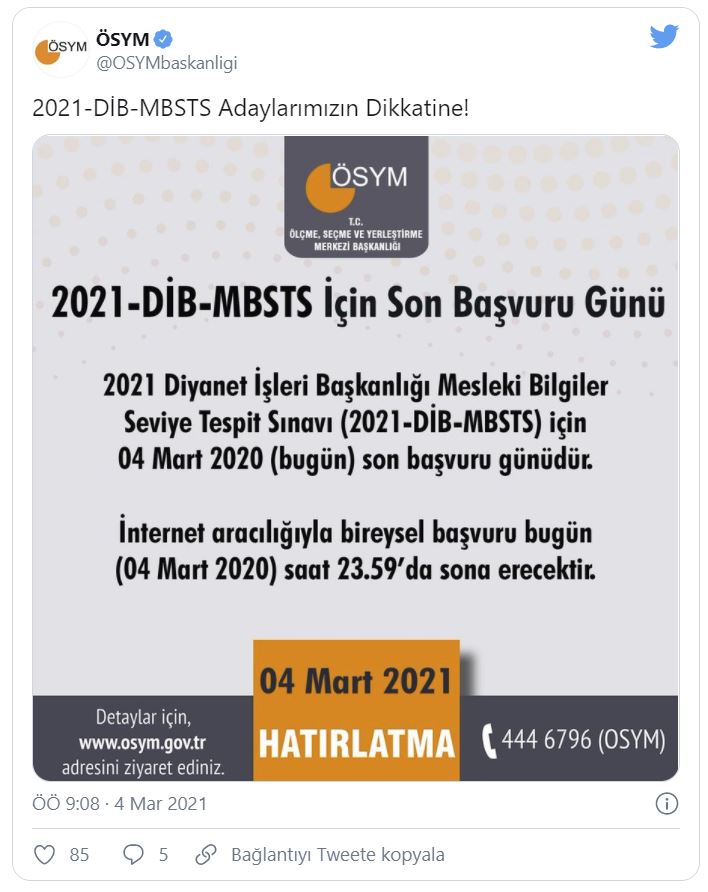 Ölçme, Seçme ve Yerleştirme Merkezi Başkanlığı (ÖSYM), Diyanet İşleri Başkanlığı Mesleki Bilgiler Seviye Tespit Sınavına (2021-MBSTS) girecek adaylara başvuru için son gün hatırlatmasında bulundu.