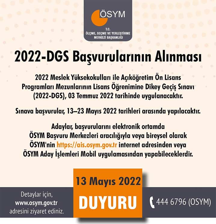 Meslek Yüksekokulları ile Açıköğretim Ön Lisans Programları Mezunlarının Lisans Öğrenimine Dikey Geçiş Sınavı (2022-DGS), 03 Temmuz 2022 tarihinde uygulanacaktır.