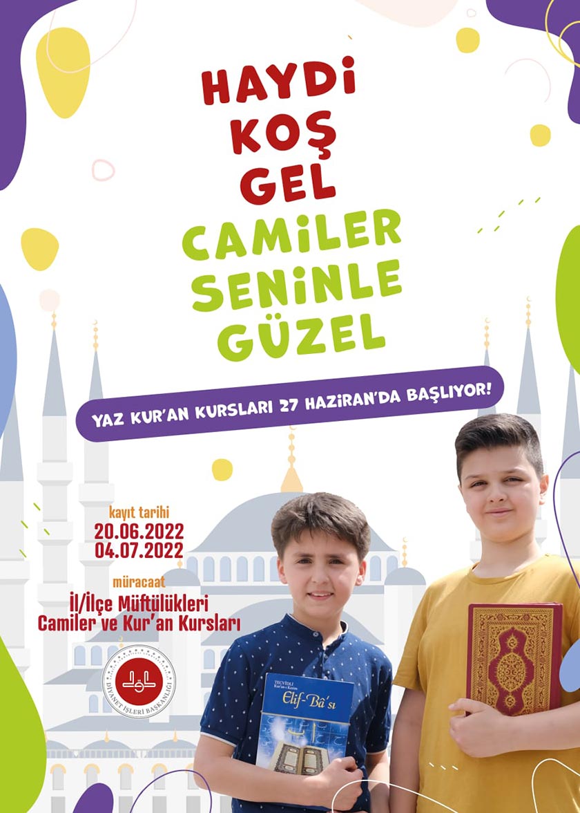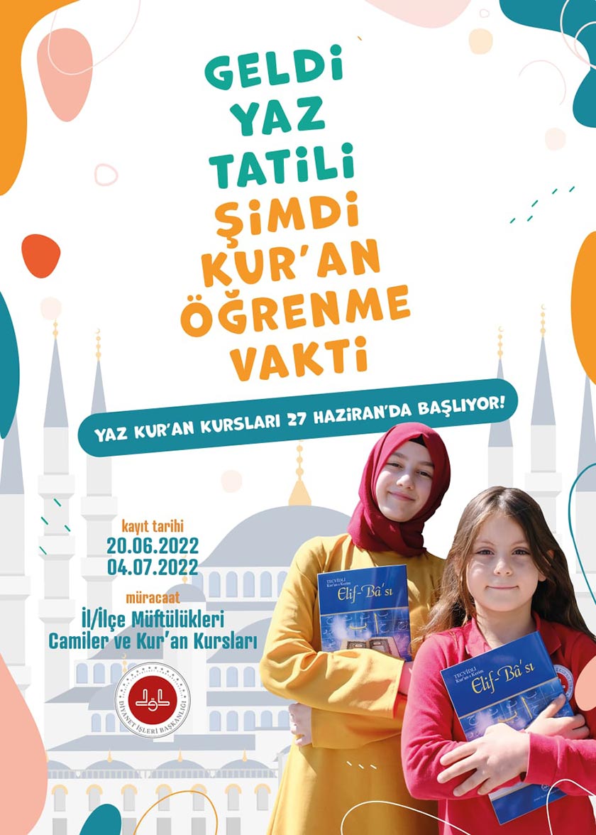 Diyanet İşleri Başkanlığı bu yıl 90 bini aşkın camide düzenleyeceği 2022 Yaz Kuran Kursları tanıtım afişlerini yayınladı.