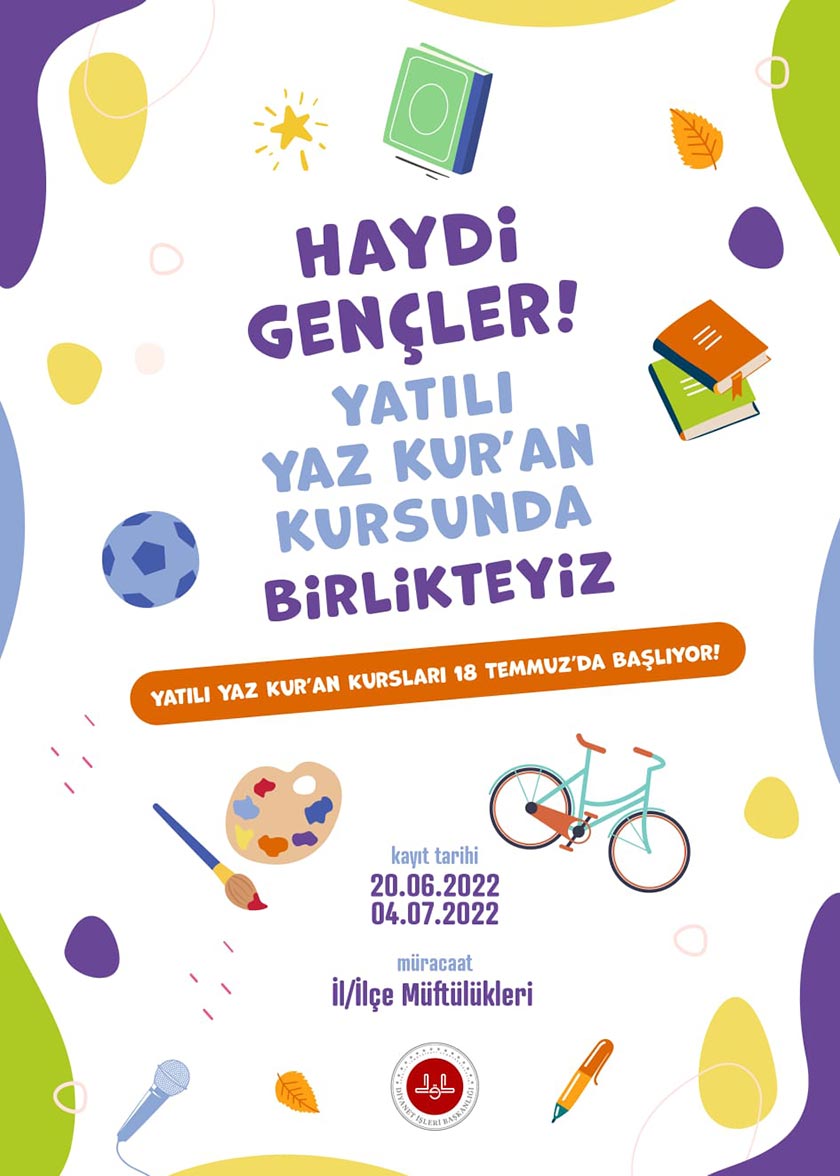 Geldi Yaz Tatili Şimdi Kur'an Öğrenme Vakti, Haydi Koş Gel Camiler Seninle Güzel, Haydi Gençler Yatılı Kur'an Kursunda Birlikteyiz, temalarıyla hazırlanan 2022 Yılı Yaz Kur'an Kursu afişleri tüm cami ve uygun mekanlara asılacak.