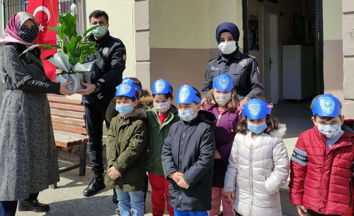 Kur’an kursu öğreticileri rehberliğinde Küçükçekmece Polis Merkezi’ni ziyaret eden minikler, polislere çiçek takdiminde bulundular.