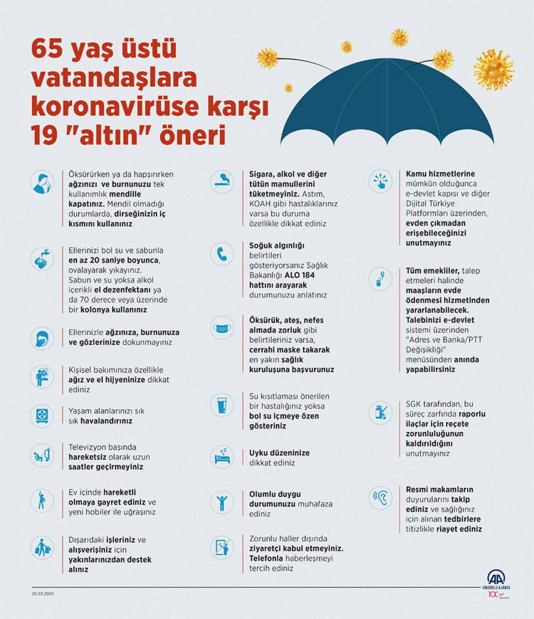 AA muhabirinin edindiği bilgilere göre, Aile, Çalışma ve Sosyal Hizmetler Bakanlığına bağlı Engelli ve Yaşlı Hizmetleri Genel Müdürlüğünün hazırladığı "Koronavirüse Karşı 65 Yaş ve Üzerindeki Kişilere Tavsiyeler" listesinde yaşlıların koronavirüsten nasıl korunabilecekleri aktarılıyor.