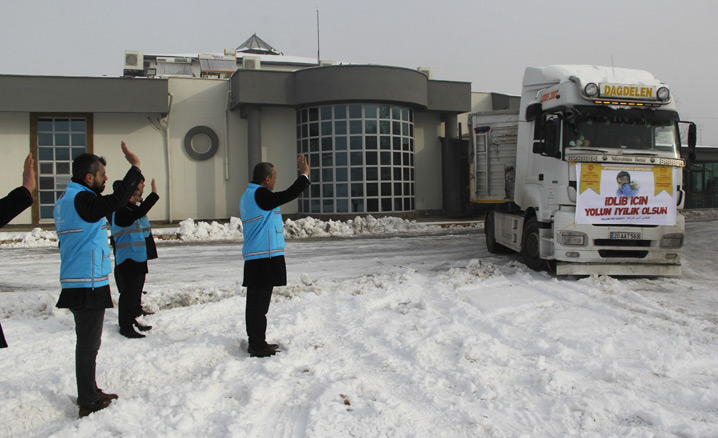 Konuşmaların ardından yardım malzemesini taşıyan tırlar, dualarla Suriye’nin İdlib kentine doğru yola çıktı.
