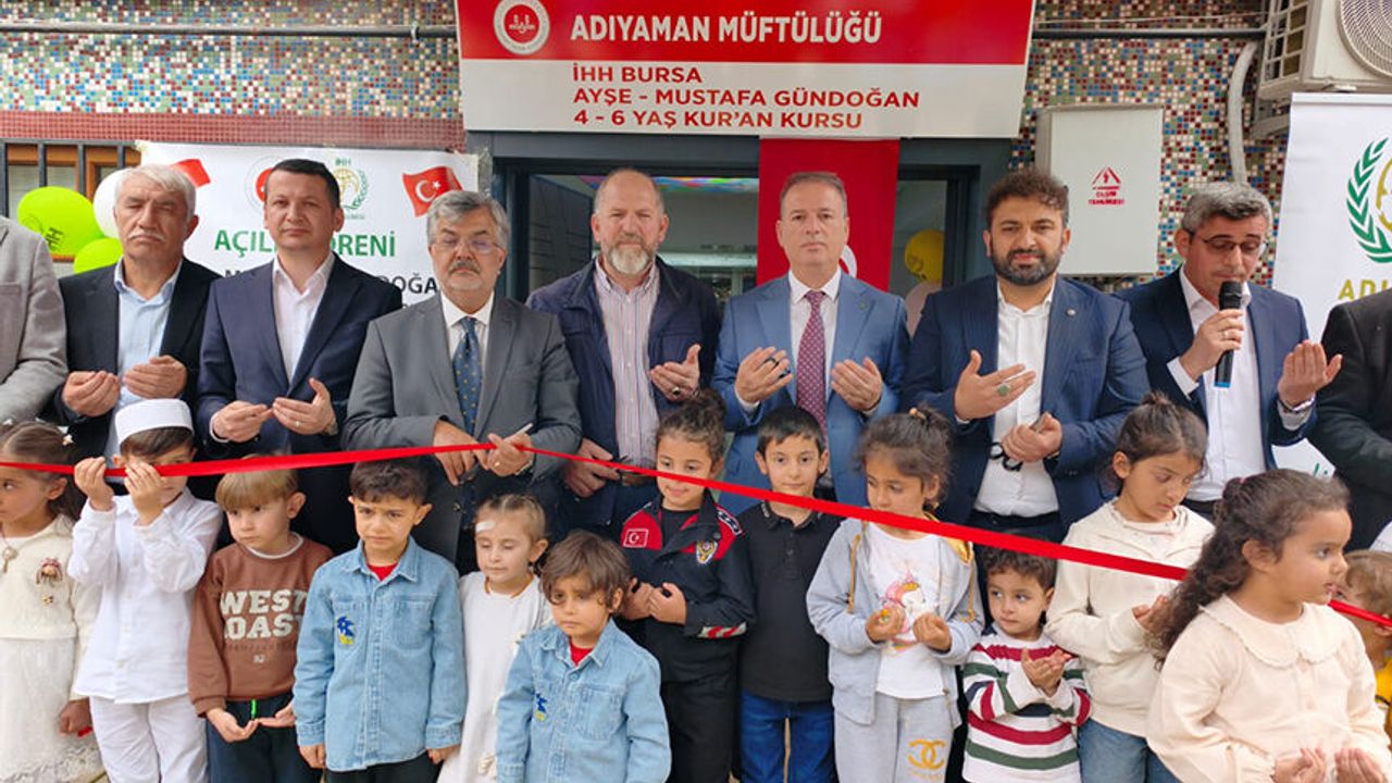 Adıyaman İl Müftülüğü ve Bursa İHH iş birliğinde hayata geçirilen Ayşe–Mustafa Gündoğan 4-6 Yaş Kur’an Kursu’nun açılış programına Adıyaman İl Müftü Yardımcısı Hilmi Benli, İl Milli Eğitim Müdürü Ali Tosun, Bursa İHH Şube Başkanı Hüseyin Kaplan, Adıyaman İHH Başkanı Mücahit Tekin, Bursa İHH Şube Müdürü Abdulmelik Yalvarıcı, sivil toplum kuruluşu temsilcileri ve çok sayıda vatandaş katıldı.