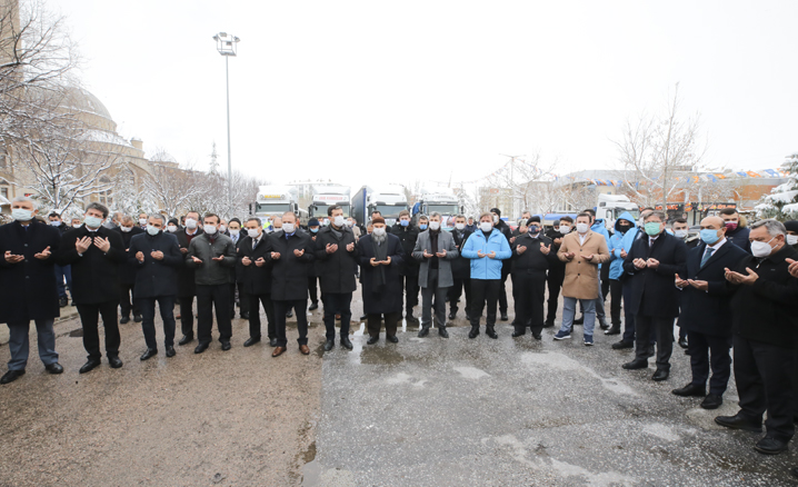 İl Müftüsü Hasan Hüseyin Güller'in yaptığı duanın ardından yardım malzemelerini taşlıyan 14 tır, Suriye'ye doğru yola çıktı.