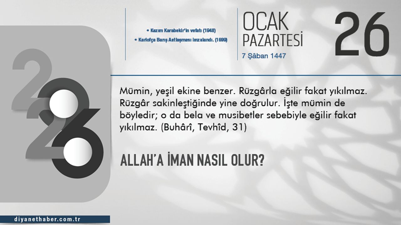 Allah Teâlâ, âlemlerin Rabbidir. Her türlü hamd ve sena, kudret ve azamet, yücelik ve üstünlük O’na mahsustur. Göklerde ve yerde ne varsa O’nundur. Rabbimiz, mutlak güç ve sonsuz hikmet sahibidir. Ölümü ve hayatı var eden, dilediğini yücelten, dilediğini alçaltan O’dur. Allah’a iman, İslam’la şereflenmenin ilk şartıdır. Allah’ın varlığına, birliğine, eşi, benzeri ve ortağı olmadığına inanmak, yani tevhidi kabul etmek, iman esaslarının temelidir. Bizi yoktan yaratan ve sayısız nimetiyle yaşatan Rabbimizin üzerimizdeki en büyük hakkı, O’na iman etmemizdir. Allah’a iman, O’nun görevlendirdiği Peygambere ve gönderdiği Kitab’a uymayı, çizdiği sınırlara ve verdiği hükümlere teslim olmayı gerektirir. Mümin, Allah’a iman etmeyi sadece bir sözden ibaret görmez. Aksine Allah’a iman etmek, hem Kur’an-ı Kerim’in ayetleri hem de Peygamberimizin hadisleri vasıtasıyla Rabbimizi tanımayı ve hayatını bu iman üzere yaşamayı zorunlu kılar.