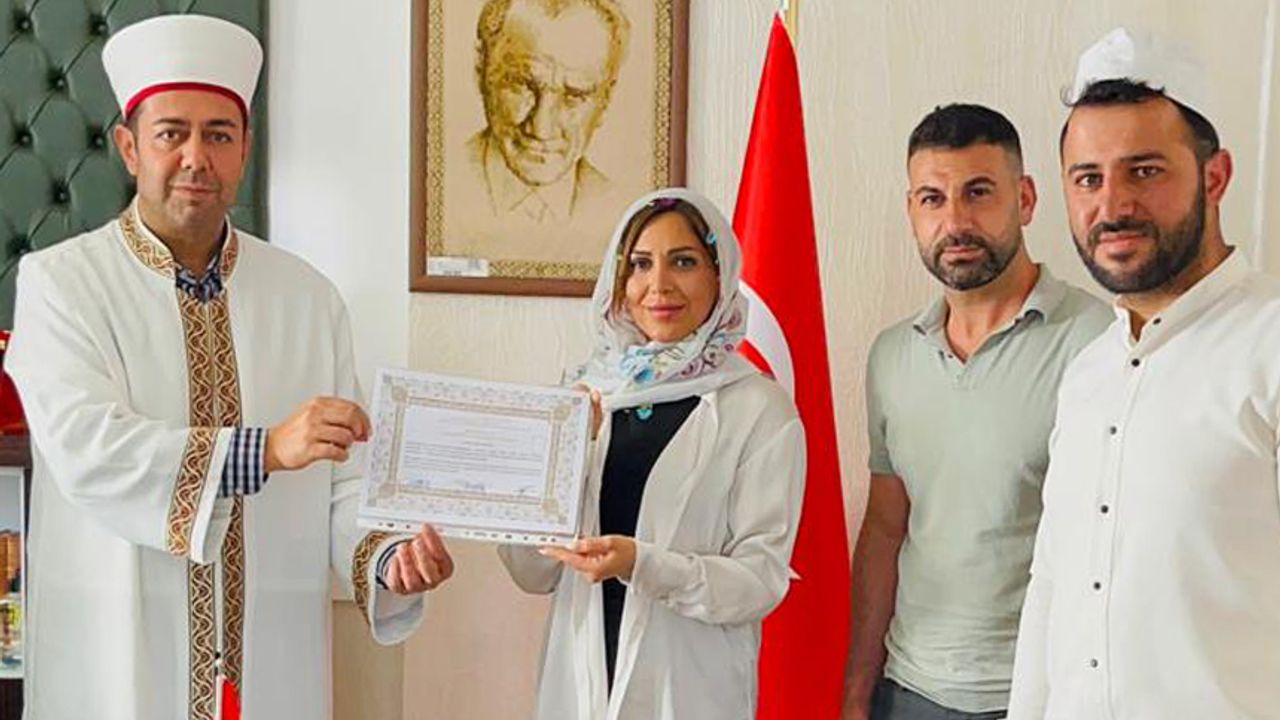 Burada düzenlenen ihtida merasiminde Kur'an-ı Kerim tilaveti dinleyen Shıma Ghodsi'ye İlçe Müftüsü İrfan Çavaş, İslam dininin temel esasları hakkında detaylı bilgiler verdi.
