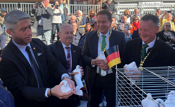 120 bini aşkın katılımcının iştirak ettiği Hasat Bayramı geçit töreni sonunda, Fürth Belediye Başkanı Thomas Jung, Marmaris Belediye Başkanı Mehmet Oktay ve Fürth DİTİB Mevlana Camii Başkanı Refet Avcı barış ve dostluğun pekişmesi adına beyaz güvercin uçurdu.