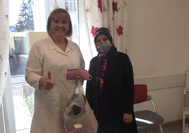 Bad Kreuznach DİTİB Merkez Camii Kadınlar Kolu Başkanı Nazmiye Ceyhan, bir kaç gönüllü ile birlikte işe koyulduklarını ve hastane personeli için koruma maskesi diktiklerini ifade etti.