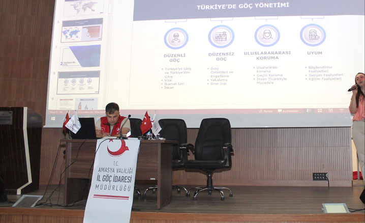 Eğitimde göçmenlere yönelik bilgiler aktaran İl Göç İdaresi Müdürlüğü personeli Nursu Kayalar, düzenli ve düzensiz göç, uluslararası koruma ve uyum gibi konularda sunum yaptı.