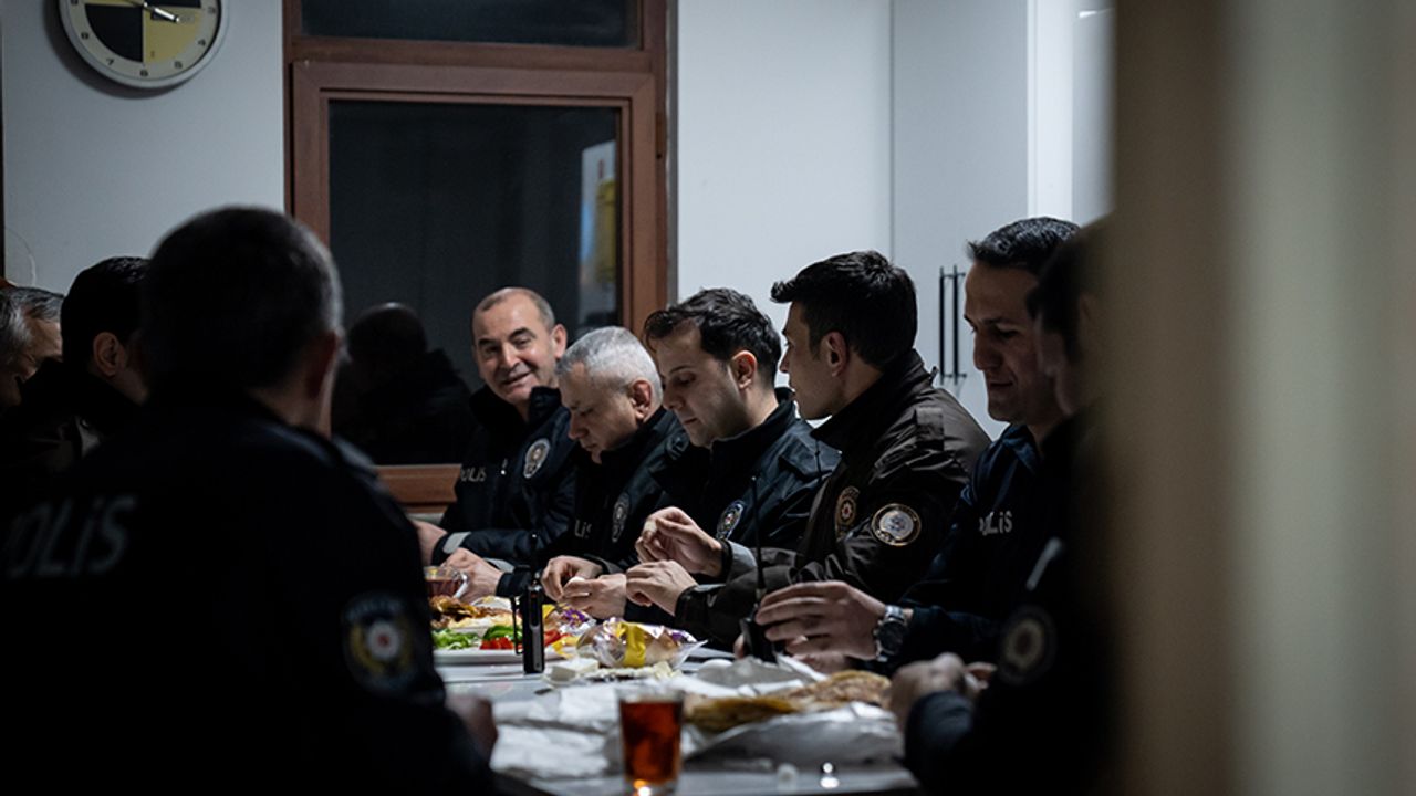İlk sahur için el birliği ile kurdukları sofrada bir araya gelen polisler, peynir, zeytin, yumurta, domates ve ekmekle sahurlarını yaptıktan sonra çaylarını içip mesailerine devam etti.