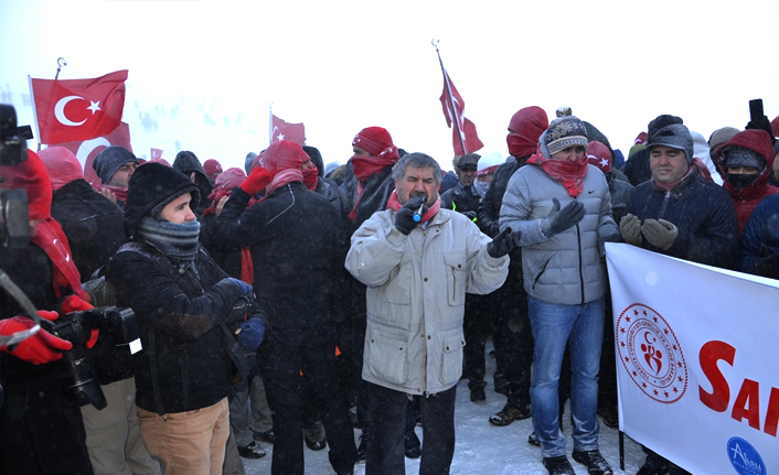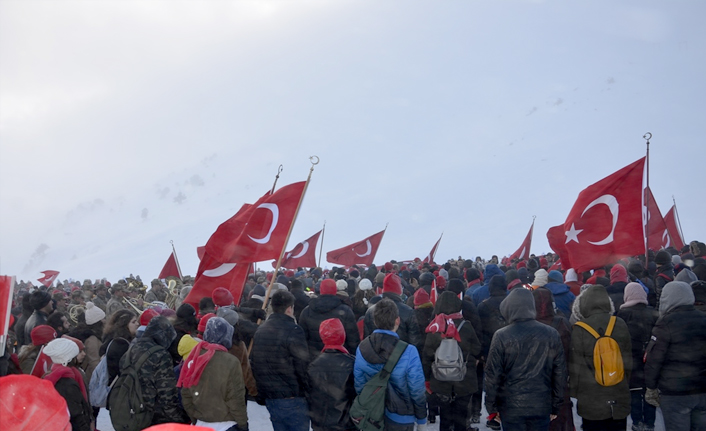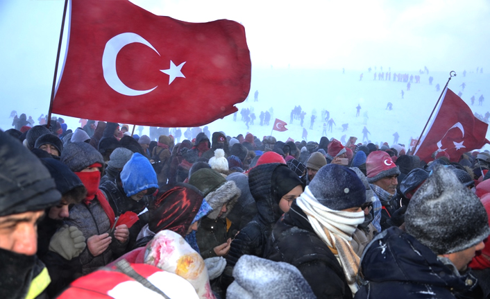Şehitleri anma programına soğuk ve karlı havaya rağmen katılan 2 bin kişi, ilk olarak saygı duruşuna durarak akabinde hep bir ağızdan İstiklal Marşı'nı okuyup karlı yolda 150 metre uzunluğunda Türk bayrağı taşıdı.