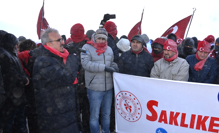Karaloğlu, “Allahuekber Dağı'nı aşmak isteyen ordumuz maalesef kışlık kıyafetler olmadan, bizim gibi kepi paltosu olmadan eksi 30-40 derecede çoğunluğu donarak şehadete ulaştı. Rabbim Sarıkamış ve tüm şehitlerimize rahmet eylesin. 2 senedir Antalya'da Sarıkamış şehitlerini anma programını Saklıkent'te idrak ediyoruz. Geçen sene güneşli bir gündü, kar üzerinde yürümüştük. Bu sene biraz daha Sarıkamış'taki şehitlerimizin yaşadığını hissettirmek için belli ki rabbimizin bir lütfudur, bir tipide buradayız. Şu anda yarım saattir buradayız ama hepimiz son derece üşümüş durumdayız. Biz de iliklerimize kadar Sarıkamış şehitlerimizi burada hissettik, yâd ettik. Rabbim şehitlerimizin yolundan kıyamete kadar yürümeyi bizlere nasip etsin. Rabbim bu topraklarda kıyamete kadar birliğimizi, beraberliğimizi, kardeşliğimizi muhafaza ederek var olmayı bizlere nasip etsin.” dedi.