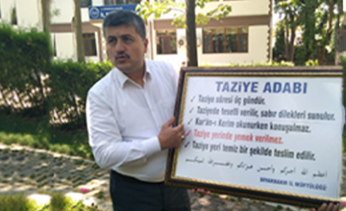 “Taziye evlerinde verilen yemeklerin vatandaşa yük olmaya başlaması nedeniyle, cami müştemilatında bulunan taziye evlerinde yemek verilmemesi için yazı gönderdik. Taziye evlerine ‘Yemek Verilmez” yazıları astık. Hutbelerde ve vaazlarda bu konuyu dile getirmeleri için din görevlilerini bilgilendirdik.”