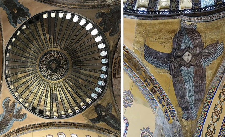 "Serafim meleklerinin yüzleri, Fatih Sultan Mehmet'ten Sultan Abdülmecit dönemine yani 19. yüzyılın ortalarına kadar yaklaşık 400 yıl boyunca açıktaydı. Gerek Evliya Çelebi'nin anlatımında gerekse sonraki dönemlerde Ayasofya iç mekânını resmetmiş Avrupalı seyyahların betimlemelerinde bu meleklerin yüzleri açık görülmektedir. Ancak 1847-49 yılları arasında Ayasofya onarımlarını yürüten İtalyan asıllı mimar Fossati tarafından bunların yüzü sıvanıp maskeyle örtülmüştür. Bugün gördüğünüz Ayasofya'nın tavan ve yarım kubbe süslemelerinde Fossati'nin dekorasyon anlayışı oldukça baskındır ve mevcut durum Ayasofya'nın Klasik Osmanlı cami görünümünden farklıdır."