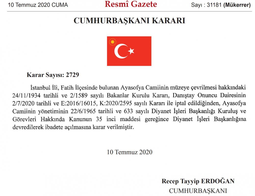 SON DAKİKA - Ayasofya Kararnamesi Cumhurbaşkanı Recep Tayyip Erdoğan imzasıyla Resmi Gazete'nin 10 Temmuz 2020 tarih ve 31181 (Mükerrer) sayısıyla yayımlandı.