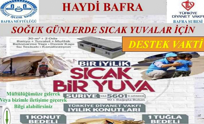 Kampanyanın devam ettiğini belirten Müftü Kayar, “Türkiye Diyanet Vakfı aracılığıyla müstakil olarak ev yaptırmak isteyen hayır sahibi vatandaşlarımızın bağışları Vakıf şubemizce alınmaya devam edecektir. Bu vesile ile kampanyaya destek veren Bafralı hayırseverimize, iş adamlarımıza ve hayırda yarışan değerli din gönüllüsü mesai arkadaşlarıma şahsım ve İdlib’deki mağdur ve mazlum din kardeşlerimiz adına teşekkür eder, hayırlarının kabulünü Yüce Allah’tan niyaz ederim.” dedi.