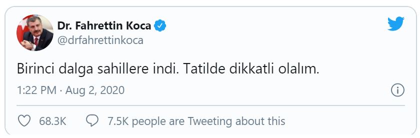 Koca, paylaşımında, "Birinci dalga sahillere indi. Tatilde dikkatli olalım." ifadelerini kullandı.