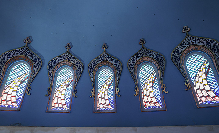 Projesinde su ve denizcilikle ilgili detaylara yer verdiklerini belirten Külünk, "Ana kubbemiz gemi dümeni süslemesi şeklinde. Tam ortasında 16 yıldızlı bir pusulamız var. Hepsinden kıymetlisi de ana kubbe yazımızda suyun ve denizin önemine işaret eden İbrahim Suresi 32. ayet-i kerimesi yer alıyor. Yazıyı Hasan Çelebi hocanın talebesi Ferhat Kurlu yazdı. Tezhip ve süslemeleri ise Mustafa Çelebi hazırlıyor. Denize atıf yapacak süslemeler ve mavi tonlara yer verdik. Ana kubbemizin etrafındaki 32 penceremizde yelkenli ve mavi vitraylar yer alıyor. Minarelerimizde martı detayları yer alıyor." diye konuştu.