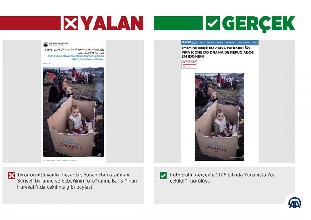 Türkiye'nin güney sınırında oluşturulmaya çalışılan terör koridorunu yok etmek, bölgeye barış ve huzur getirmek amacıyla başlatılan Barış Pınarı Harekatı aleyhine sosyal medyada yürütülen dezenformasyon girişimlerinde, Suriye'deki çatışmalardan kaçan sivillerin görüldüğü fotoğraflar harekat sırasında çekilmiş gibi çarpıtılmak istendi.