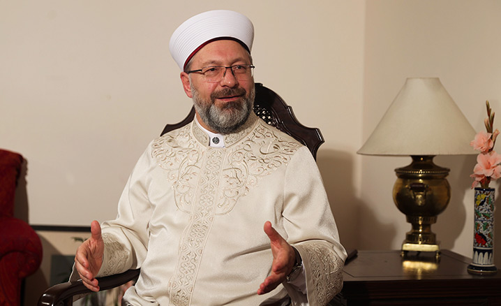 “Diyanet İşleri Başkanlığı, Türkiye’nin her yerinde olan tek kurumdur ve sistematik bir teşkilatımız var. Şehirlerinden ilçelere, kasabalara, köylere varıncaya kadar her caminin imamı Diyanet İşleri Başkanlığı’na bağlıdır. Türkiye’nin 81 vilayetinde 922 ilçesinde Diyanet İşleri Başkanlığı’nın müftülükleri vardır. Türkiye’de 90 bine yakın cami ve bin 3 müftülüğümüz vardır. 150 bine yakın da personelimiz var. Diyanet İşleri Başkanlığı bünyesinde imam, müezzin, vaiz ve bütün bu hizmetleri murakabe eden murakıplarımız ve müfettişlerimiz var. Bu, ülkemizde birliğin, beraberliğin, vahdetin sağlanması için çok önemli bir avantajdır, fırsattır. Cuma günü 90 bin camide aynı konudaki bir hutbeyi okutabiliyoruz. Hatta bu hutbeleri İngilizce, Fransızca, Almanca, Rusça, Çince, İspanyolca gibi dillere de tercüme edip internet sitesine yüklüyoruz. Bütün dünya hutbelerimizden istifade edebiliyor. Yurt dışında da 120 kadar ülkede 2 bin 500 kadar personelimiz var.”