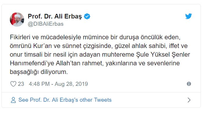 Erbaş kişisel resmi sosyal medya hesaplarından yayınladığı mesajında "Hakkari'de atış esnasında ağır silah mühimmatının patlamasıyla şehit olan kahraman Mehmetçiklerimize Allah’tan rahmet, yaralılarımıza acil şifalar ve milletimize başsağlığı diliyorum." dedi.