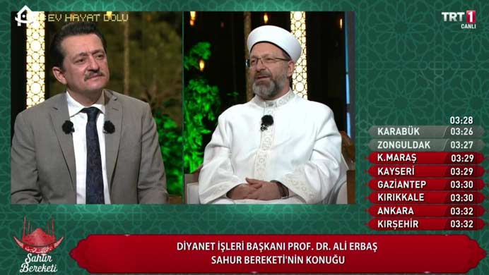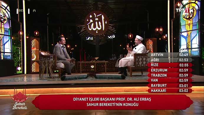 Rahmet ve mağfiret ayı Ramazan’ın son sahurunda TRT1 televizyonunun “Sahur Bereketi” programına konuk olan Diyanet İşleri Başkanı Prof. Dr. Ali Erbaş, tüm vatandaşları bayram sabahı minarelerden yükselecek tekbir seslerine eşlik etmeye davet etti.