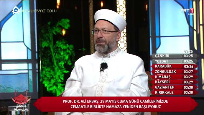 TRT1 Televizyonunda “Sahur Bereketi” programının konuğu olan Diyanet İşleri Başkanı Prof. Dr. Ali Erbaş, Türkiye’de tek bir noktada bayram namazı kılınıp hutbe okunacağını ifade ederek, “Bayram sevinç günleri demektir, mutluluk günleri demektir. Birliğin beraberliğin en fazla tezahür ettiği, görünür olduğu anlardır bayramlar. Bizim de iki dini bayramımız var; birincisi Ramazan bayramı diğeri Kurban bayramı. Allah Resülü Efendimiz (s.a.s.) Medine-i Münevvere’ye hicret ettiği zaman oradaki insanların bazı bayramlar kutladığını görüyor. Diyor ki, “Nedir bu bayramlarınız?” Eski geleneklerden aldık diyorlar. Allah Resülü Efendimiz (s.a.s.) buyuruyor ki, “Allah Teâlâ sizin bu bayramlarınızı Ramazan ve Kurban bayramlarıyla değiştirdi.” buyuruyor. O günden itibaren bayramlar bu şekilde değerlendiriliyor. Huzur günleri, mutluluk günleri, sevgi ve saygının geliştirilmesine zemin hazırlayan günler olarak değerlendiriliyor.” şeklinde konuştu.