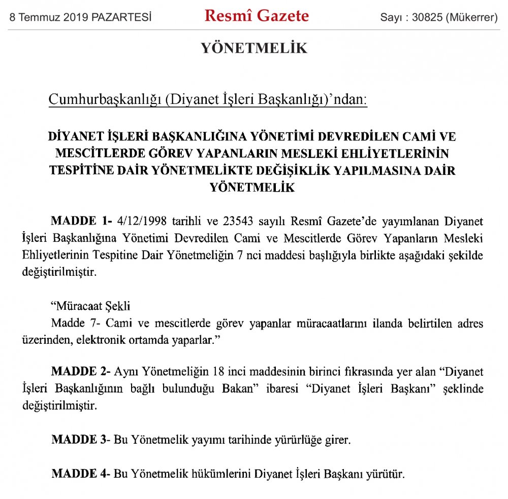 Diyanet İşleri Başkanlığına Yönetimi Devredilen Cami ve Mescitlerde Görev Yapanların Mesleki Ehliyetlerinin Tespitine Dair Yönetmelikte Değişiklik Yapılmasına Dair Yönetmelik
