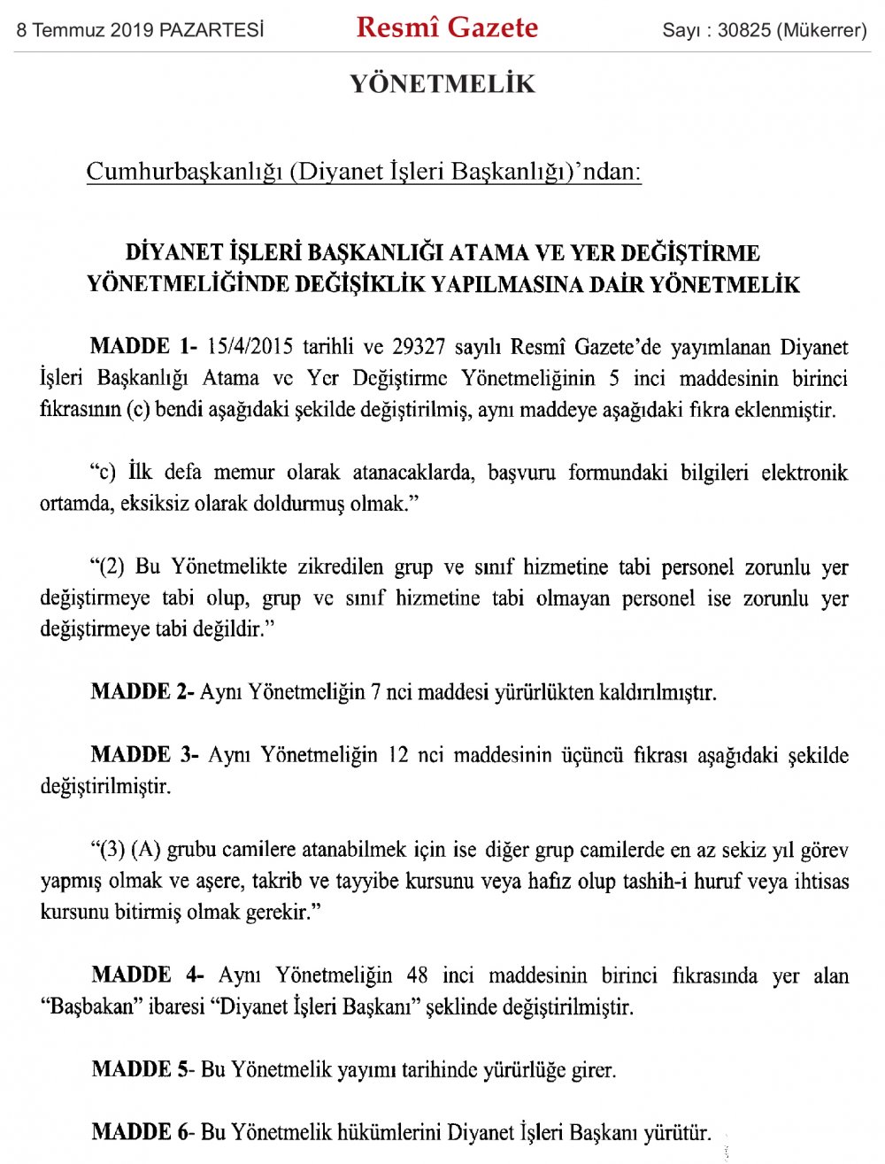 Diyanet İşleri Başkanlığı Atama ve Yer Değiştirme Yönetmeliğinde Değişiklik Yapılmasına Dair Yönetmelik
