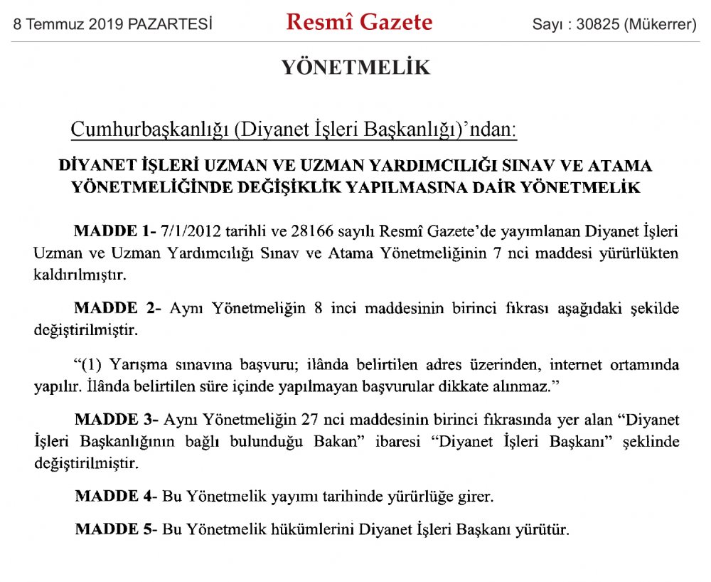 Diyanet İşleri Başkanlığı Sınav Yönetmeliğinde Değişiklik Yapılmasına Dair Yönetmelik