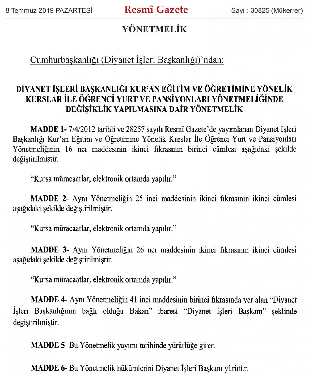 Diyanet İşleri Başkanlığı Kur’an Eğitim ve Öğretimine Yönelik Kurslar ile Öğrenci Yurt ve Pansiyonları Yönetmeliğinde Değişiklik Yapılmasına Dair Yönetmelik