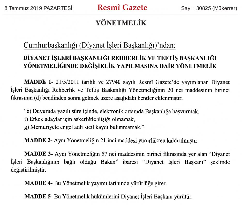 Resmi Gazete'nin Mükerrer sayısnda yayımlanan yönetmelik değişklikleri şöyle;