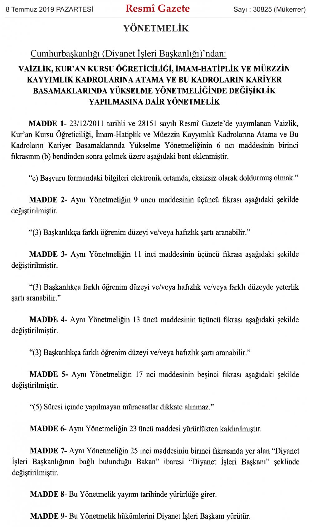 Vaizlik, Kur’an Kursu Öğreticiliği, İmam-Hatiplik ve Müezzin Kayyımlık Kadrolarına Atama ve Bu Kadroların Kariyer Basamaklarında Yükselme Yönetmeliğinde Değişiklik Yapılmasına Dair Yönetmelik
