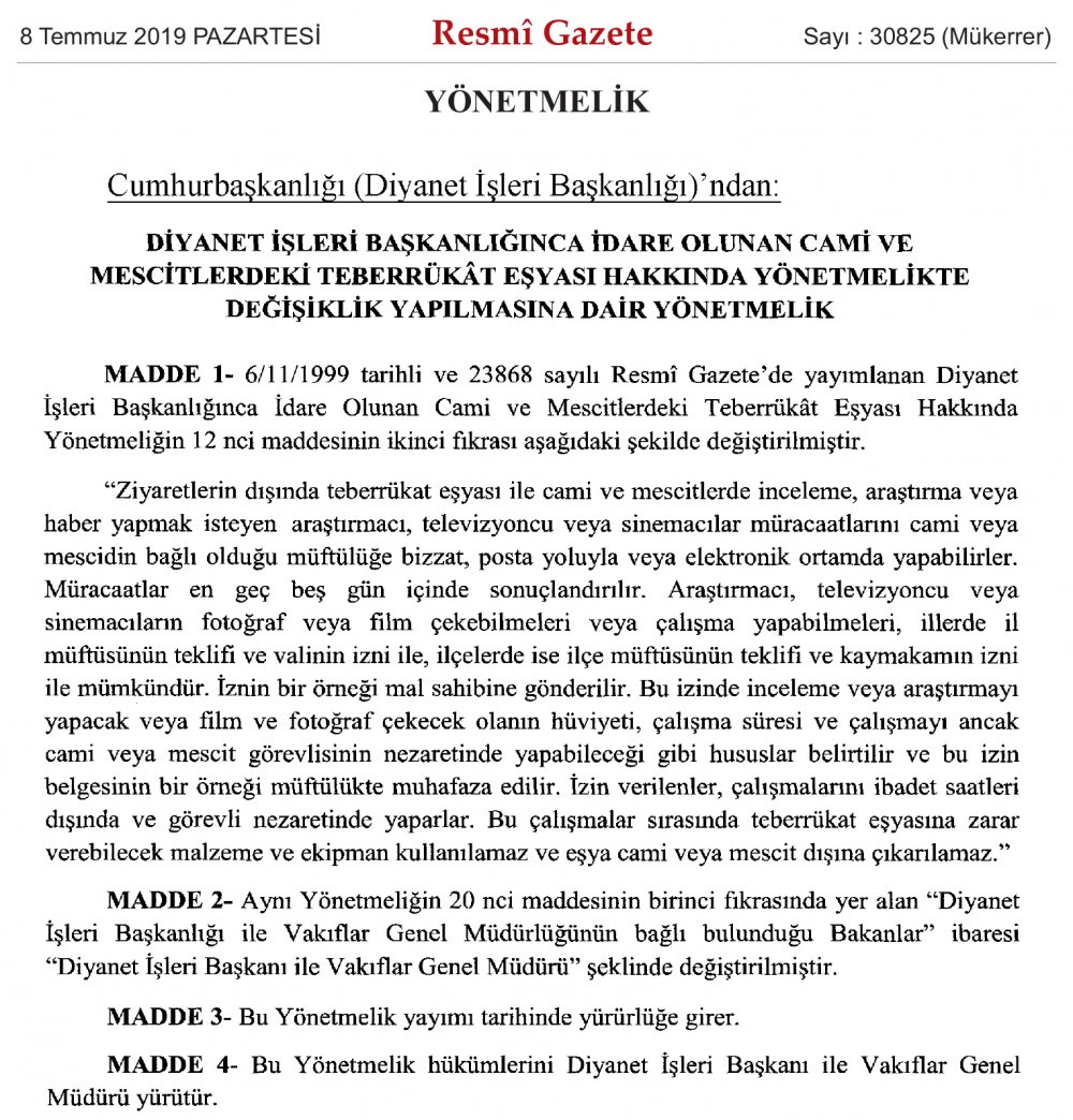 Diyanet İşleri Başkanlığınca İdare Olunan Cami ve Mescitlerdeki Teberrükât Eşyası Hakkında Yönetmelikte Değişiklik Yapılmasına Dair Yönetmelik