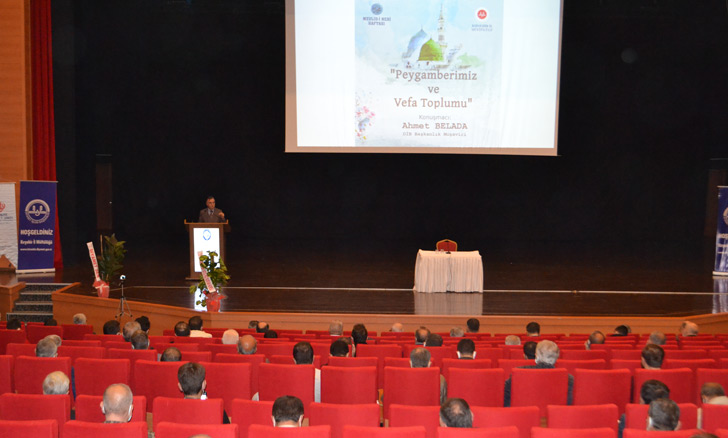 Ardından “Peygamberimiz ve Vefa Toplumu” konulu konferansını sunmak üzere kürsüye davet edilen Diyanet İşleri Başkanlığı Başkanlık Müşaviri Ahmet Belada, “Peygamberlik mektebinde yetişen bir insanın nasıl davranması gerektiğini, onun yaşantısıyla anlarız.” dedi.