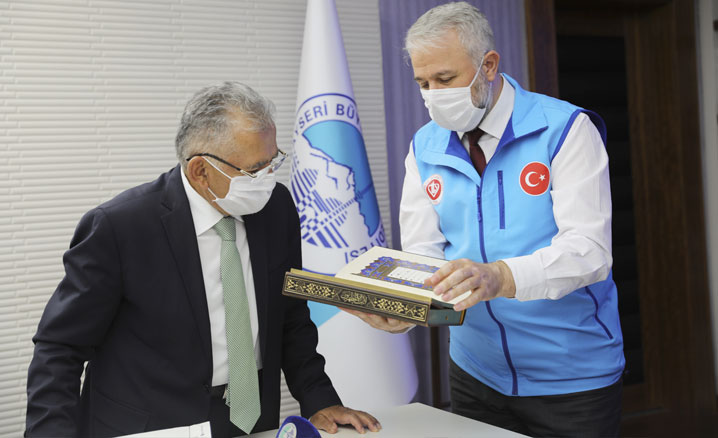Büyükşehir Belediye Başkanı Büyükkılıç’ın kendisi ve oğlu adına verdiği kurban vekaletlerini Türkiye Diyanet Vakfı adına kabul eden İl Müftüsü Güven, Büyükkılıç'a bağış makbuzları ile birlikte Kur’an-ı Kerim takdim etti.