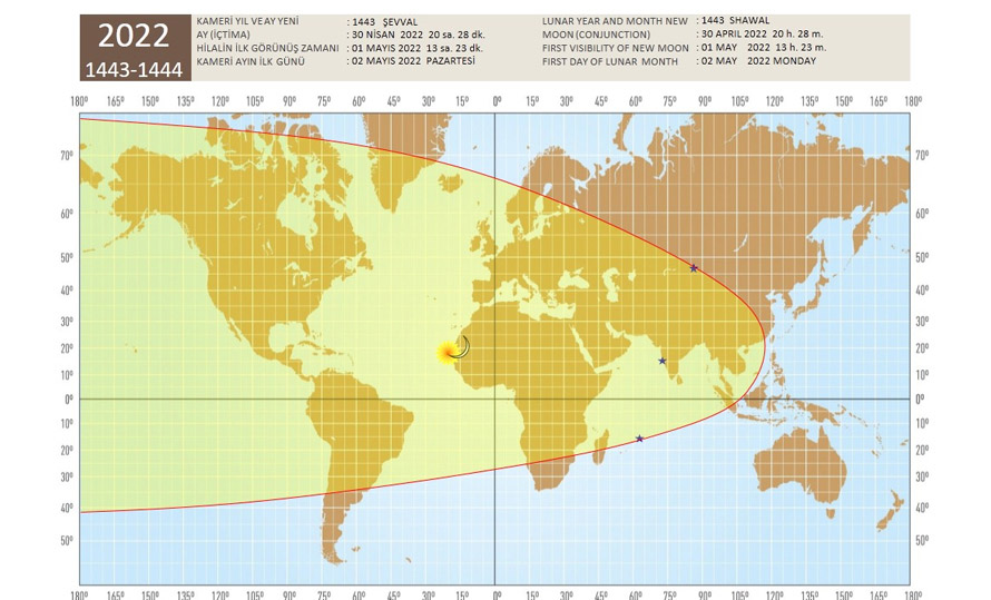 Hicrî 1443 Şevval Hilali de, 30 Nisan 2022 Cuma günü Greenwich saatiyle 20:28´de İÇTİMÂ, 01 Mayıs 2022 Pazar günü Greenwich saatiyle 13:23´de RU´YET olacak ve hilal ilk defa Asya Kıtasının güneydoğusundan ve Hint Okyanusundan itibaren görülmeye başlayacaktır.
