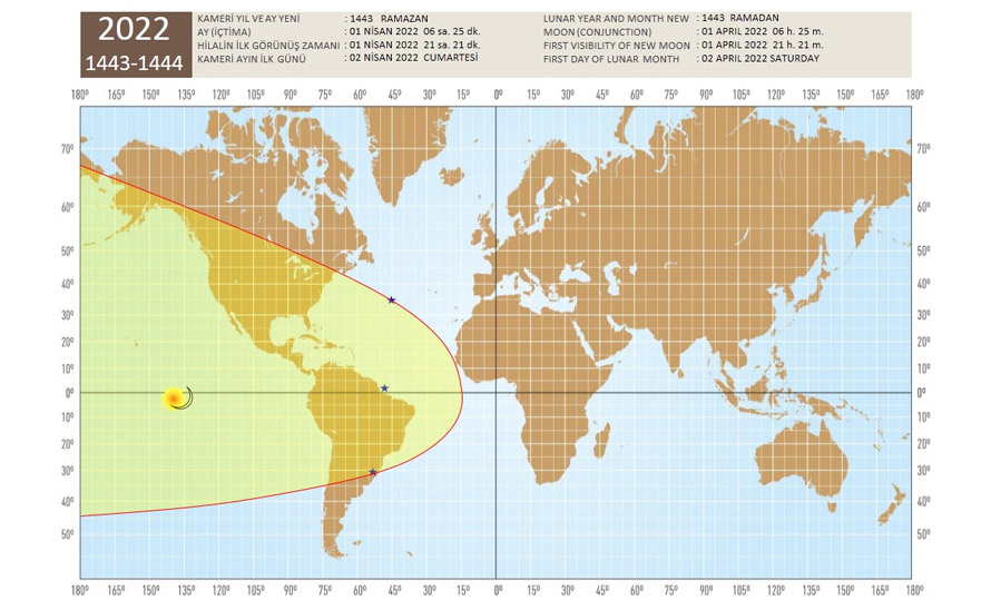 Diyanet İşleri Başkanlığı Din İşleri Yüksek Kurulu, Hicri 1443 yılı Ramazan ayı hilalinin bu yıl ilk kez Atlas Okyanusundan, Kuzey ve Güney Amerika Kıtalarının ortalarından itibaren görülmeye başlayacağını duyurdu.