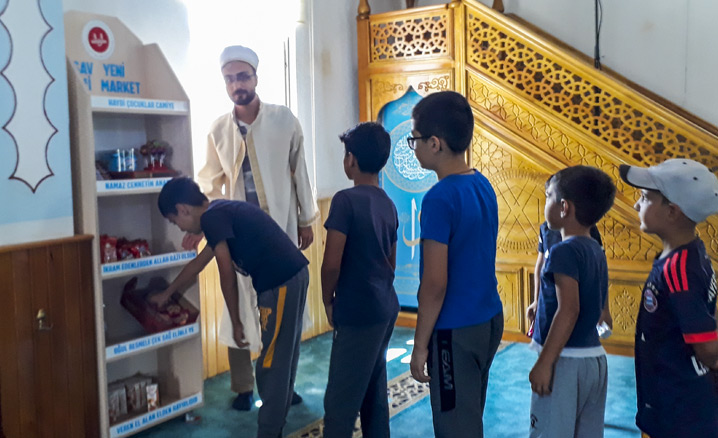 Camideki mini market uygulaması hakkında bilgilendirmede bulunan Sav Yeni Camii İmam Hatibi Harun Yiğit ise çocuklara cemaatle namaz kılma alışkanlığı kazandırmak ve onları camiye alıştırmak için böyle bir uygulama başlattığını dile getirdi.