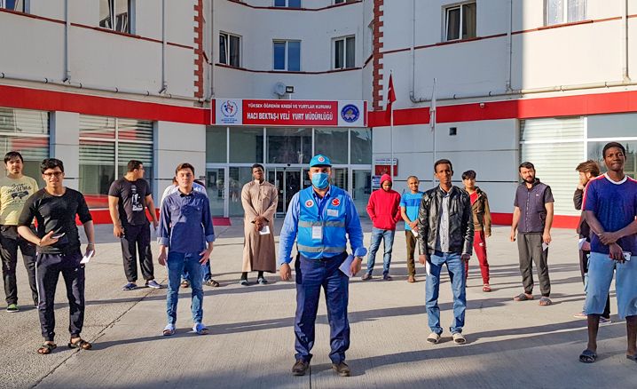 Salgın nedeniyle yurtlarından çıkamayan yabancı uyruklu üniversite öğrencilerini ziyaret ederek Nevşehirli hayırseverlerin yardımlarını ulaştıran Çiçekli Camii İmam Hatibi Ahmet Aydemir; "Sevgi ve kardeşlik bağlarımızı paylaşarak kuvvetlendirmek amacıyla içinde bulunduğumuz bu süreçte din görevlileri olarak elimizden gelen gayreti gösteriyoruz." dedi.