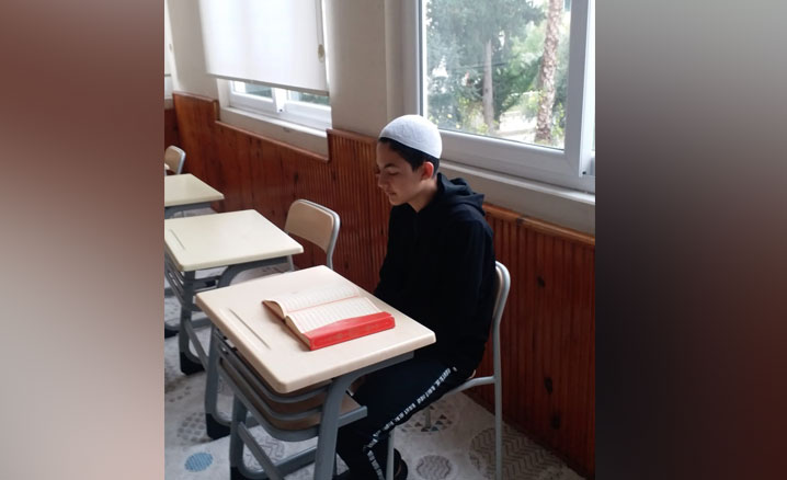 Alanya İlçe Müftülüğüne bağlı Merkez Erkek Kur’an Kursu ve Nebahat Şifa İmam-Hatip Ortaokulu öğrencisi Muhsin Enes Özdemir, Kovid-19 salgını öncesinde başlamış olduğu hafızlık eğitimini salgın nedeniyle çevrimiçi eğitimlerle tamamladı.