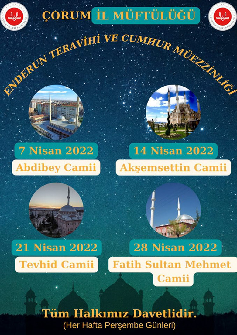 Tüm dünyada etkili olan yeni tip koronavirüs (Kovid-19) salgını nedeniyle iki yıl ara verilen Enderun usulü teravih namazı geleneği, Ramazan ayının girmesiyle birlikte Çorum’da yeniden başladı.