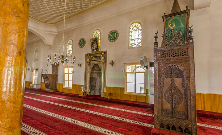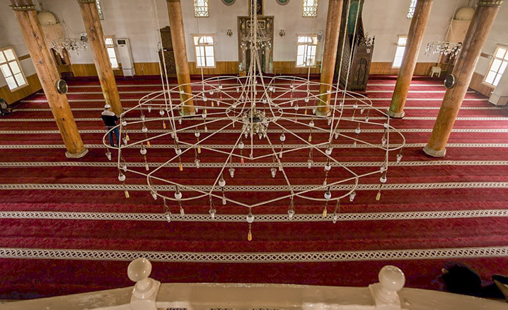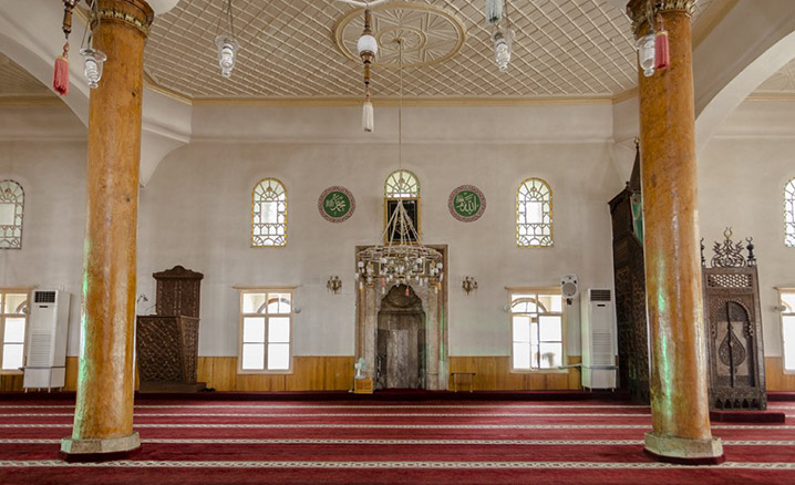 Caminin yapımında blok taşlar kullanılmış, bunların arasında üzerinde yazılar bulunan taşlar arasında Roma devrine ait taşlara da rastlanmıştır. İki sütunlu bir girişten sonra beş kubbeli bir son cemaat yeri bulunmaktadır. Bunun dışında kalan bölümler ahşap çatılıdır. Mihrap, mermer kaplama olup barok üsluptadır. Son cemaat yerinin iki tarafında birer şerefeli iki minare bulunmaktadır.