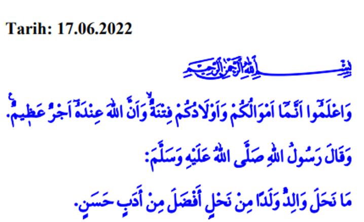 Okuduğum Ayet-i kerimede Yüce Rabbimiz şöyle buyuruyor: "Biliniz ki, mallarınız ve çocuklarınız birer imtihan sebebidir ve büyük mükâfat Allah’ın katındadır.” 1 Okuduğum hadis-i şerifte Allah Resûlü (s.a.s) şöyle buyuruyor: "Hiçbir anne baba, çocuğuna güzel terbiyeden daha kıymetli bir bağışta bulunmamıştır."2