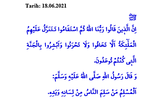 Hutbemi Yüce Rabbimizin şu ayetiyle bitiriyorum: “Şüphesiz ‘Rabbimiz Allah’tır’ deyip de, sonra dosdoğru olanlar var ya, onların üzerine akın akın melekler iner ve derler ki: ‘Korkmayın, üzülmeyin, size dünyada iken vadedilen cennetle sevinin!’”